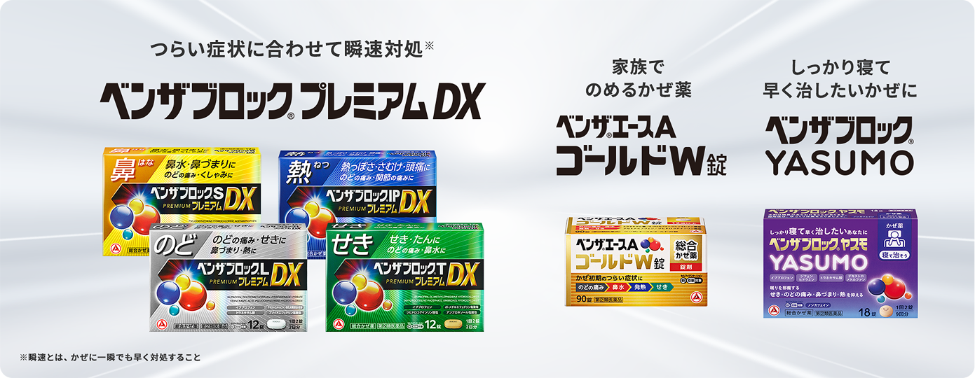 いつでも頼れる存在でありたいと考えています。 これからのかぜに、新時代の優れた効き目を。 そして、あなたのかぜに、もっと狙いを決めて。 ベンザは、いつも頑張るあなたのために、これからも進化を続けてまいります。