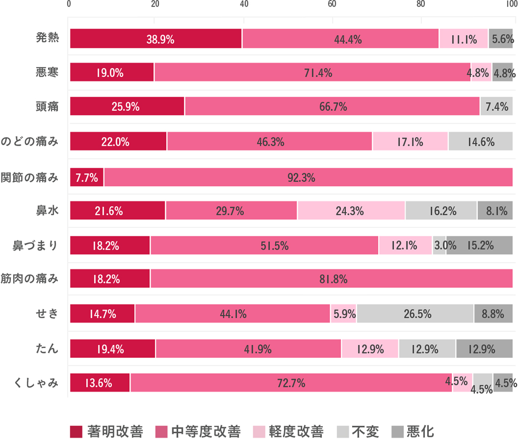 少しでも良くなった人の中で、発熱は77.8%、悪寒は82.4%が服用2日目までに、