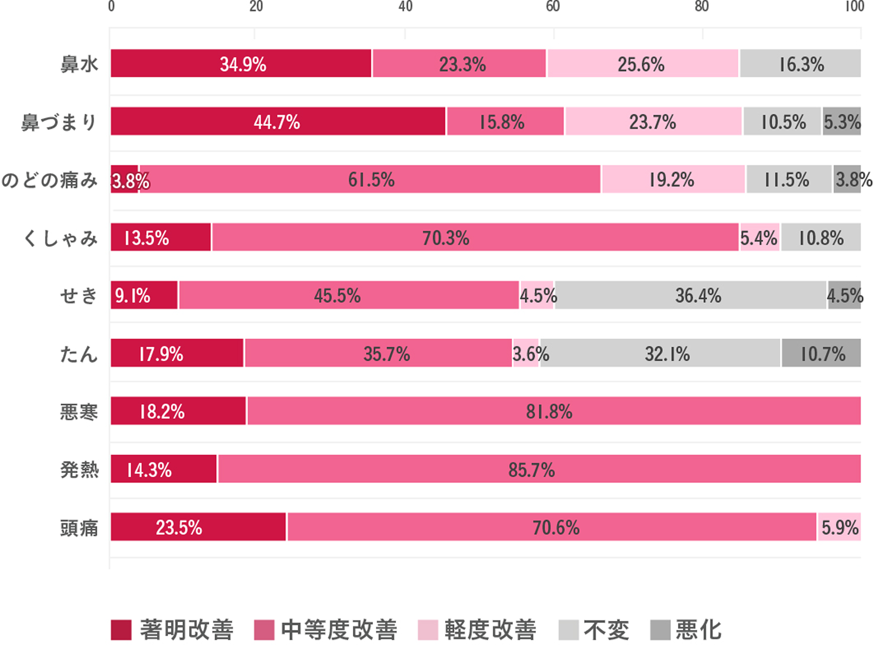少しでも良くなった人の中で、鼻水は73.7%、鼻づまりは68.8%、